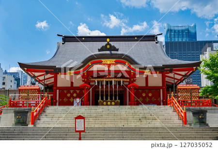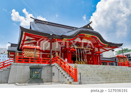 赤城神社(東京都新宿区神楽坂)の朱色の大鳥居と青空の風景