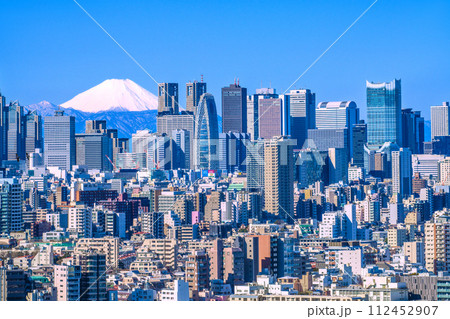 日本の東京都市景観 新景。変貌する新宿。富士山と新宿副都心などを望む。東急歌舞伎町タワーの威容も