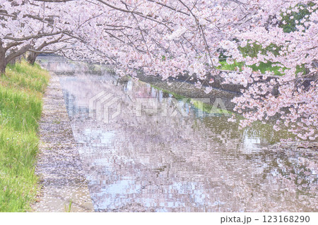 土浦市の新川沿いに咲く満開の桜並木と水面に映る桜