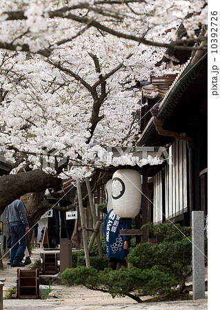 桜に提灯に水車と歴史を感じ、春を楽しめる風景写真。