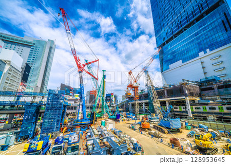 日本の東京都市景観7月27日。猛烈な暑さ…パイルドライバーなどの巨大重機がズラリ…。本格的な工事へ