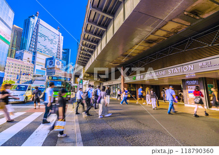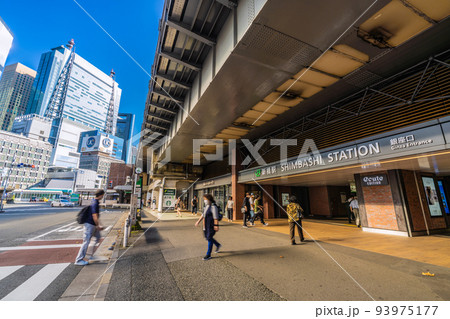 日本の東京都市景観 「東京メトロ銀座線 新橋駅出入口」や汐留の超高層ビル群などを望む