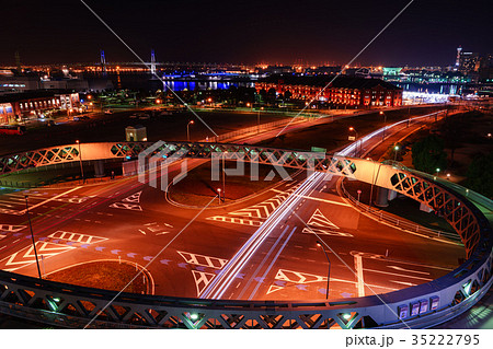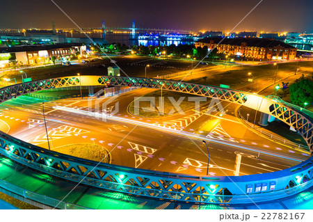 美しい楕円形の歩道橋|新港サークルウォークの夜景|神奈川県横浜市