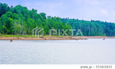 初夏の北海道 新緑の朱鞠内湖 湖畔の木