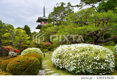 杜の都仙台 北山 輪王寺 日本庭園 三重塔 ツツジ 風景, 景色、初夏、ツツジの頃、晴, 仏教, 建
