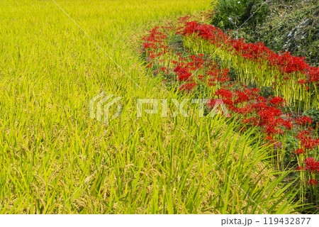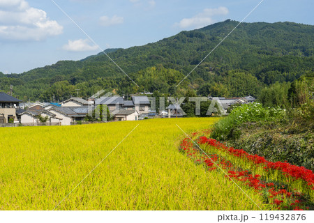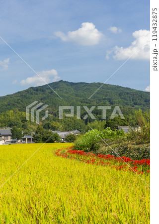 橘寺へ至る参道 稲穂が実りあぜ道に彼岸花が咲き誇る(奈良県明日香村)