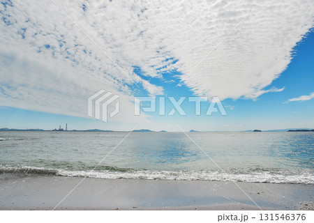 愛知・佐久島の新谷海岸と広がる三河湾、空を覆う巻積雲と水平線が織りなす離島の景観