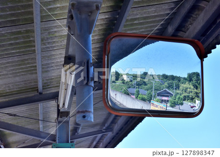 鹿島臨海鉄道大洗鹿島線新鉾田駅のホーム鏡に映る新鉾田の街の景色