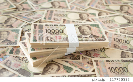 斜めのアングルで撮影した日本の新紙幣。100万円の束のネガティブなイメージ
