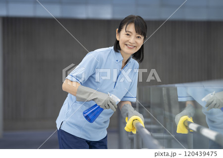 ビル清掃イメージ 通路の手すりを拭く50代の女性清掃スタッフ