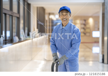 ビル清掃をするシニアのクリーニングスタッフ カメラ目線で笑顔のポートレート