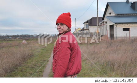Female walking red autumn landscape, suburban homes backdrop, cloudy sky framing scenic rural scene with solitary wanderer
