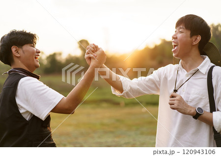 Happy Asian men looking at the beautiful sunlight during the sunset behind mountain together. Friends touch - hold hands together.