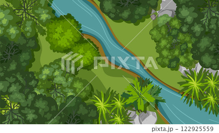 Tropical exotic resort hotel villa in jungle forest with small river flowing nearby adding to the serene atmosphere of Bali, Indonesia. Remote wild nature paradise, exotic summer travel. Aerial shot
