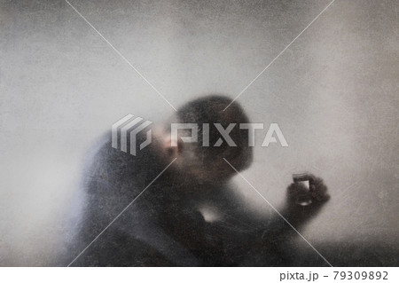 Man with a glass of vodka behind a dusty scratched glass. Alcoholism concept.