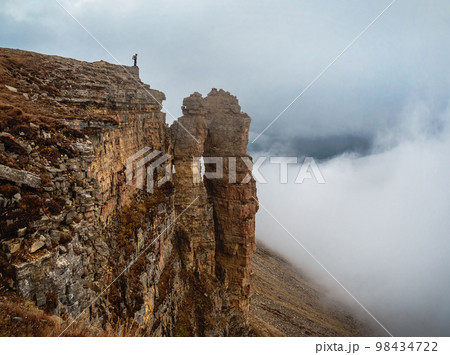 Soft focus. Tourist (man) stands on the cliff edge of Bermamyt plateau on high altitude under cloudy sky in foggy day. Rocks of Big Bermamyt - the so-called "Monks"