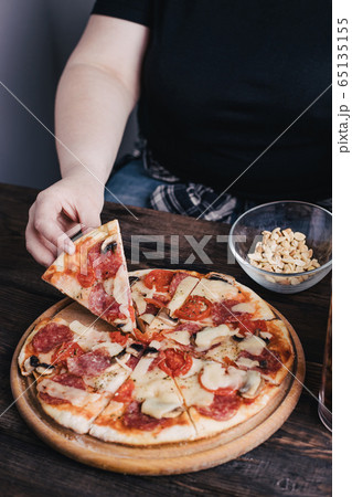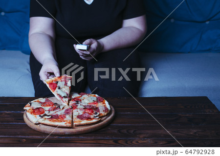 Overweight woman eating pizza