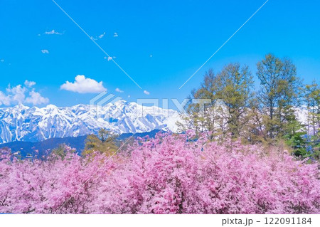 【春素材】桜と北アルプスと青空・水彩画調【長野県】