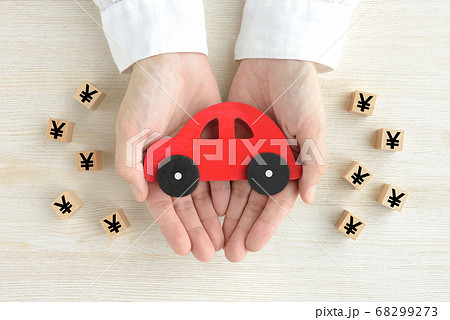 平面上に置かれた自動車のおもちゃと電卓のCGによるフォトリアルなイラスト