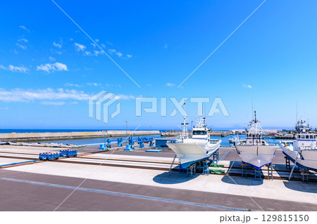 オホーツク枝幸漁港音標(おとしべ)地区と海岸、6月の青空