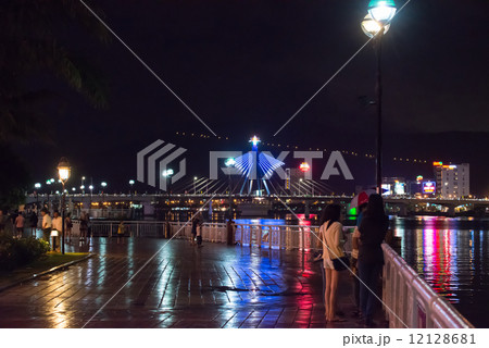 雨に濡れた公園から見る旋回橋 ハン橋 ベトナム、ダナン イルミネーション