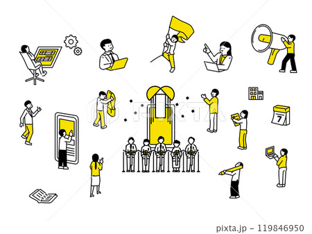 旗を掲げて進むスタートアップ企業で働く人たちのイメージイラスト素材