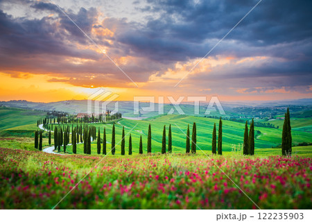 Tuscany, Italy. Sunset with typical Tuscan landscape, rows of cypress trees in spring season, sunset colored nature.