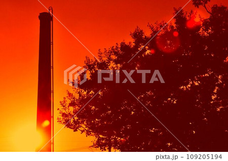 工場地帯の向こうの夕焼けの空と沈む夕日