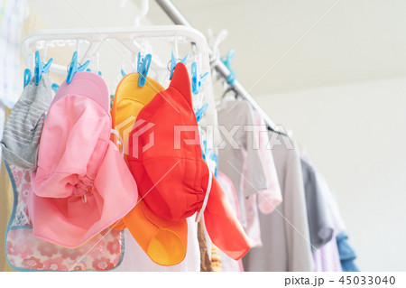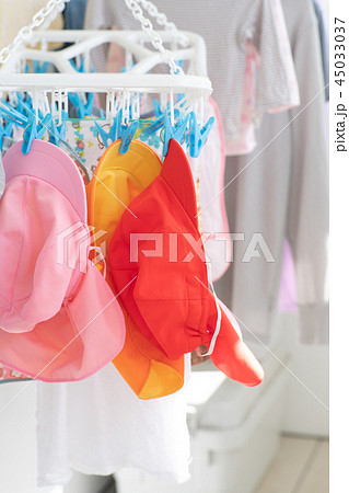 洗濯したカラー帽子を干す