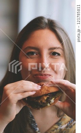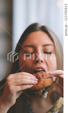 Close-up portrait of a woman in a fast food cafe eating a hamburger. Hungry woman eating a burger.