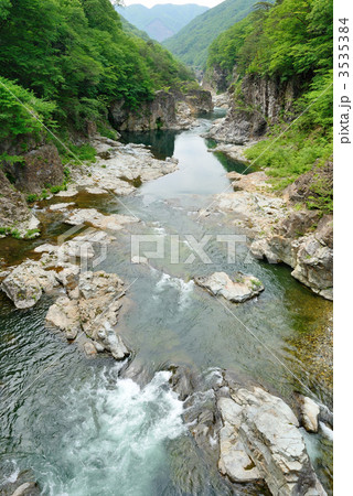 新緑の龍王峡(日光国立公園) むささび橋から下流を望む