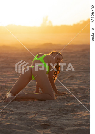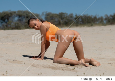 Seductive model in swimsuit kneeling on sandy beach