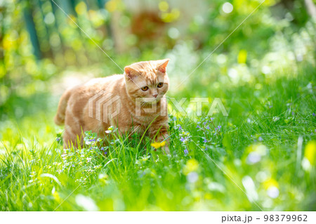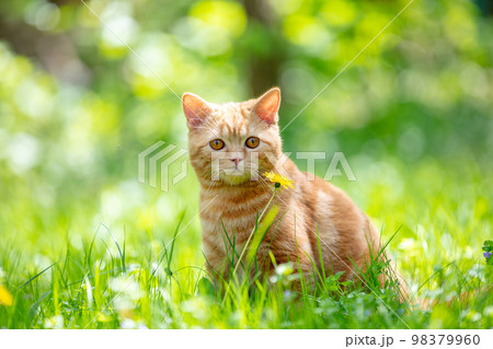 Adorable kitten cat happy on grass field with natural sunlight in garden on summer