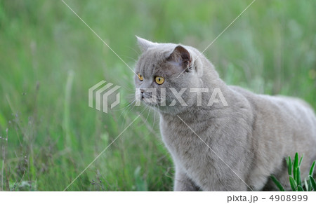 A captivating grey cat with striking yellow eyes hides in lush green grass A grey cat with yellow eyes hides in green grass