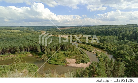 Picturesque River Valley Landscape with Lush Forest and Serene Waterscape, Beautiful Natural Scenery