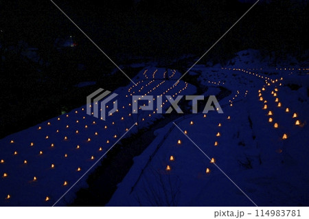 日光市湯西川温泉の湯西川沢口河川敷に点灯されて並ぶミニかまくら