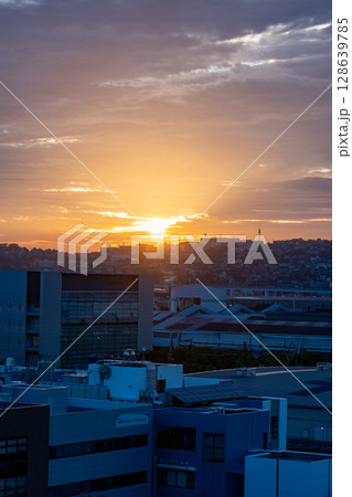 夕日に染まる都会のビル群