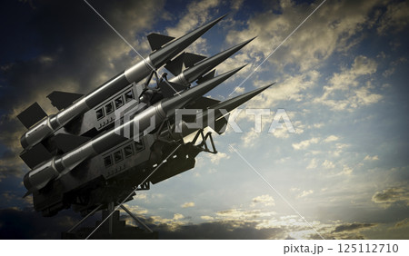 Military missile launcher with three rockets aimed upwards on rocky terrain during a sunset war