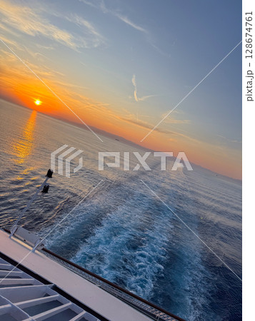 Beautiful sunset seen from a cruise ship, with golden reflections on calm sea and distant mountains on the horizon, perfect peaceful travel moment.