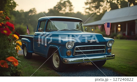 classic pickup truck decorated with American flags parked in rural landscape, country vibe