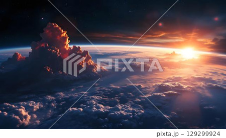 Earth seen from space, enveloped in clouds with gentle light illuminating the atmosphere, highlighting its natural splendor