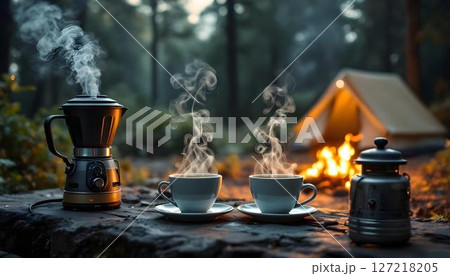 A charming camping setup with coffee and tea near a tent, surrounded by a tranquil forest, perfect for a romantic vacation
