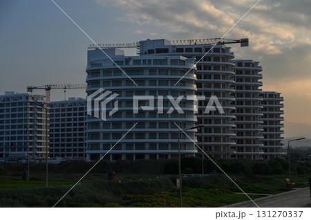 A coastal cityscape blending calm blue waters with a skyline of towering buildings and industrial zones. Puffy white clouds fill the sky, adding depth and freshness to the modern urban view.