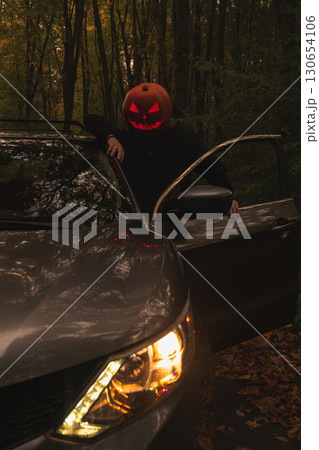 Autumn SUV with Driver with Pumpkin Head in Forest