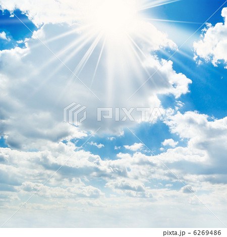 Heavenly background: bright sun shines in blue sky, light from heaven