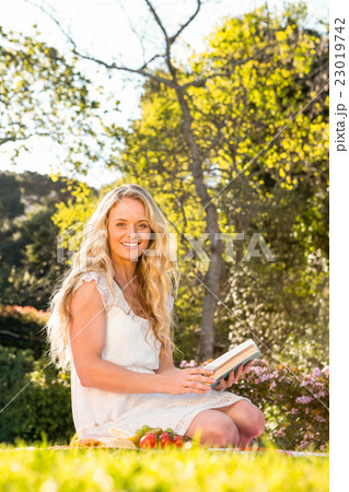 Beautiful blonde sitting on the grass reading