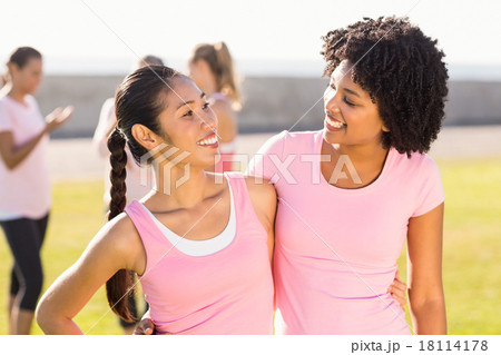 Smiling young women wearing pink for breast cancer