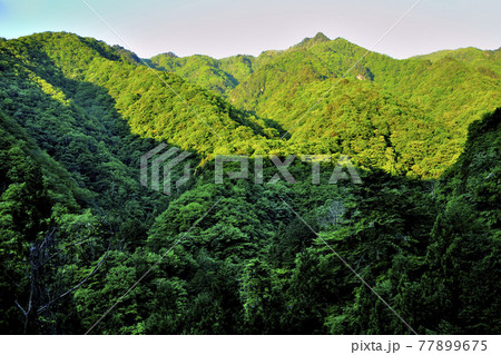 朝日射す緑の山体 両神山日向大谷より辺見岳