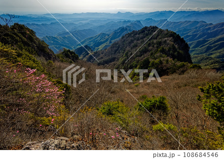 アカヤシオツツジ咲く両神山と秩父方面の眺め