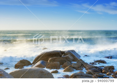 Waves crashing onto a rocky shore. A seascape view of the ocean with blue sky copy space in Camps Bay, Cape Town, South Africa. Calm, serene and tranquil beach with relaxing scenery in nature